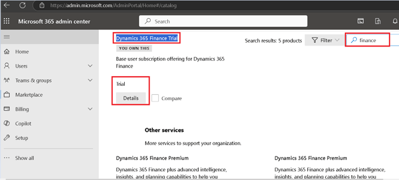 3-Get trial subscription of D365 Finance and operations from marketplace (Microsoft 365 admin center):