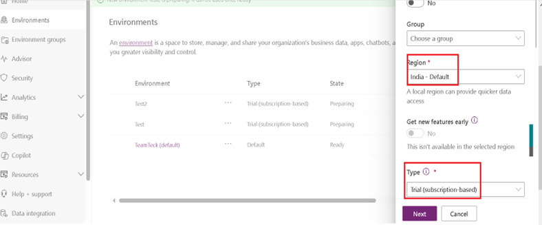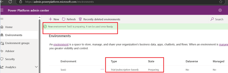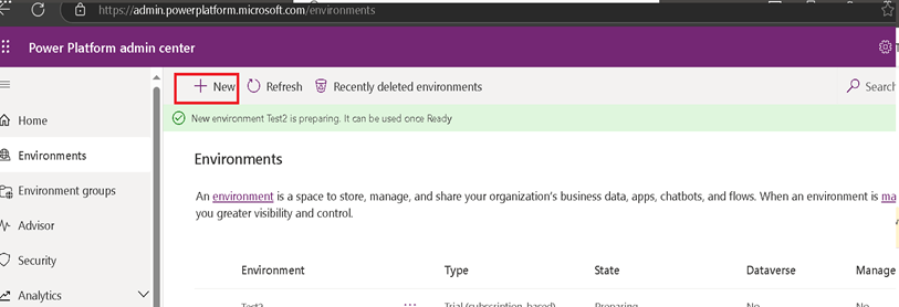 “New environment XXXXXXX is preparing. It can be used once Ready” This process takes time.(Can be within 60 minutes)