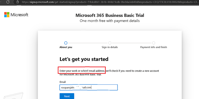 Step2-This open page asking work or school email, so once you enter any personal email like ending with Gmail etc, it suggests creating a new account.